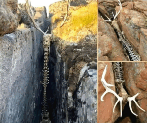 Between two ancient slabs of stone—weathered by centuries of wind and time—rests the final sculpture of nature’s quiet cruelty: the remains of a great stag, caught in the slow, geological jaws of a mountain. Its antlers still stretch toward the sky, proud and ghostly white, while its spine plunges downward into the narrow crevice, each vertebra intact like a zipper closing time shut.